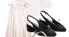 Nederdel: Gina Tricot 249 DKK (her) / Skjorte: Zara 299 DKK (her) / Ørreringe: Mango 99 DKK (her) / Sko: Mango 299 DKK (her) / Taske: Zara 329 DKK (her)